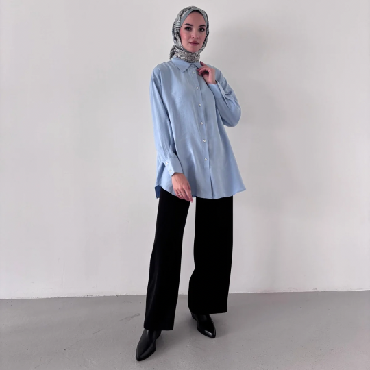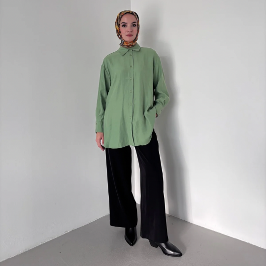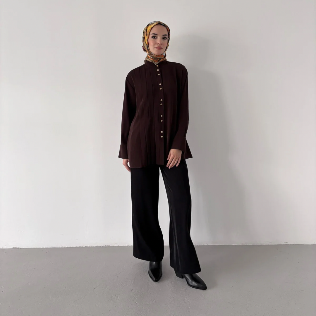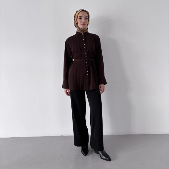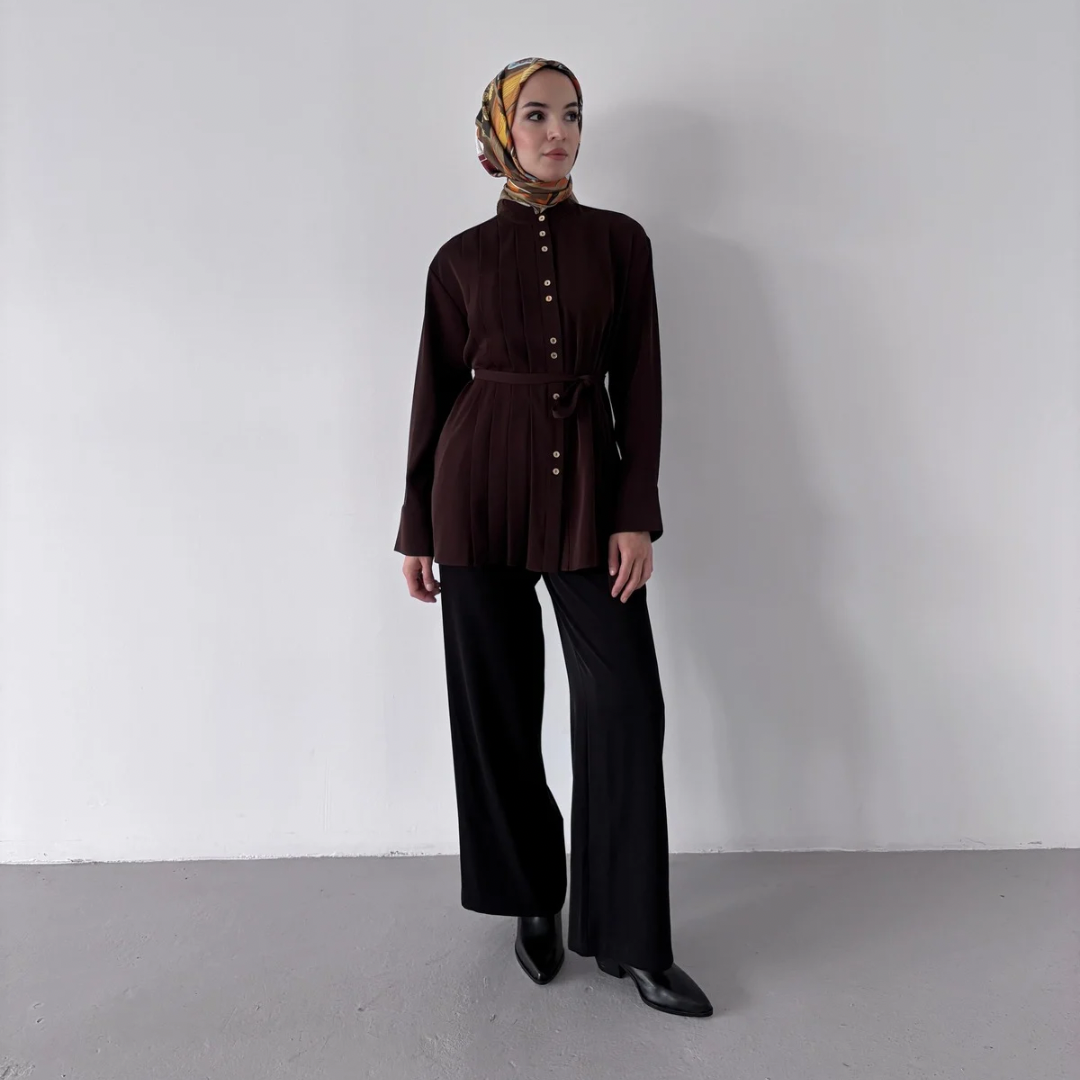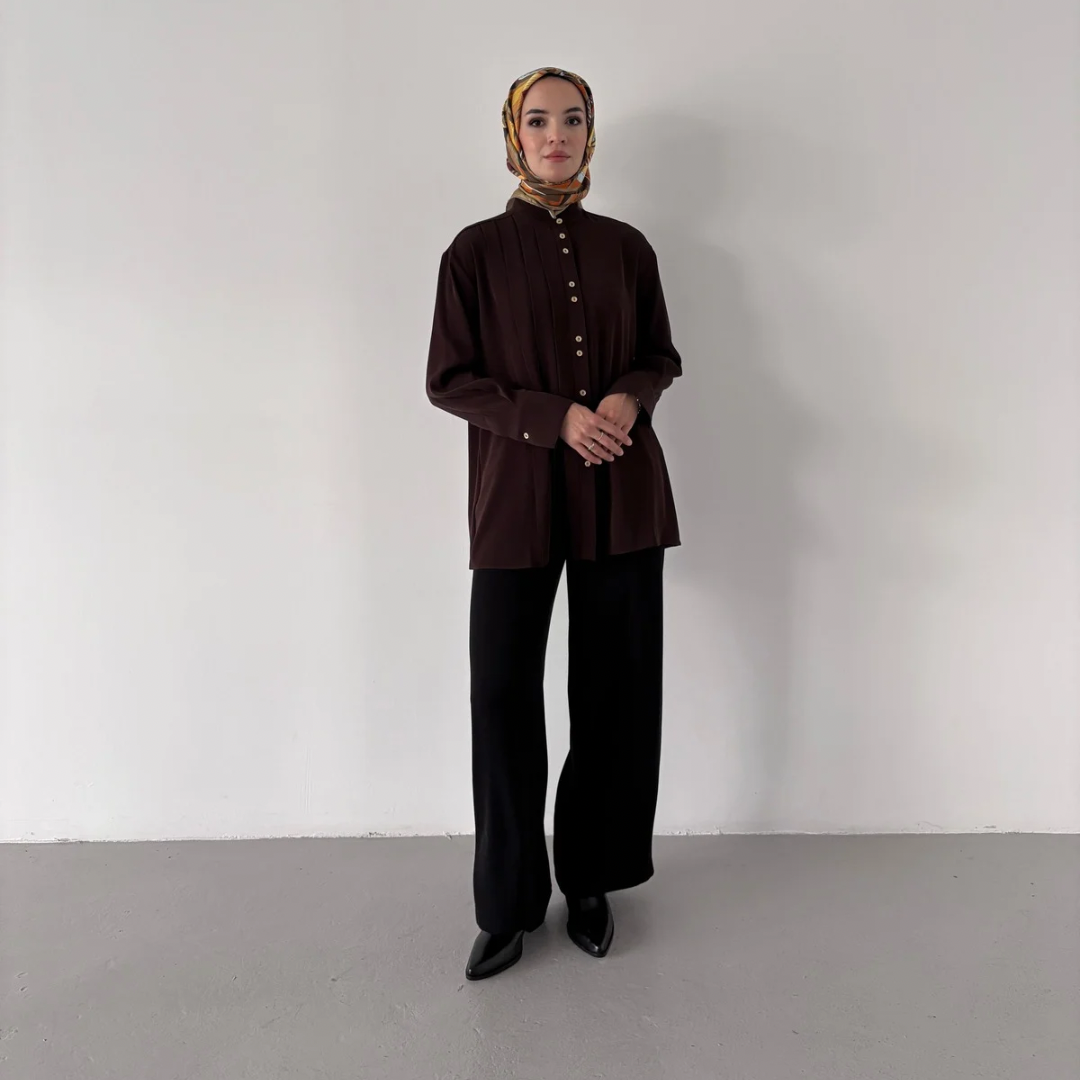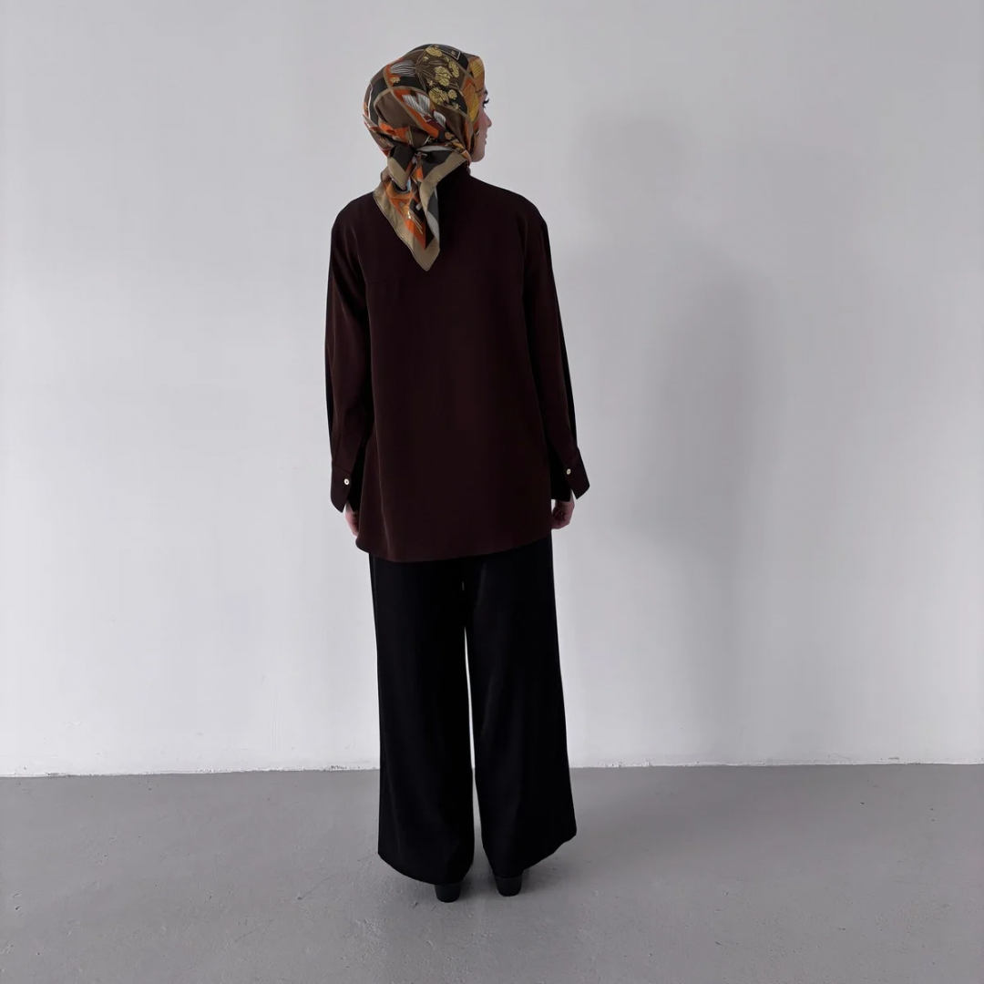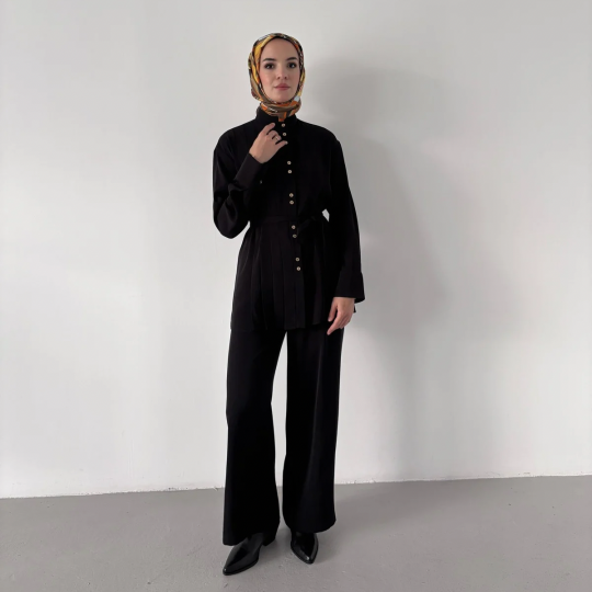 Aynı kumaş cinsinden olan siyah döküölü pantolon ile takım olarak da tercih edilebilir